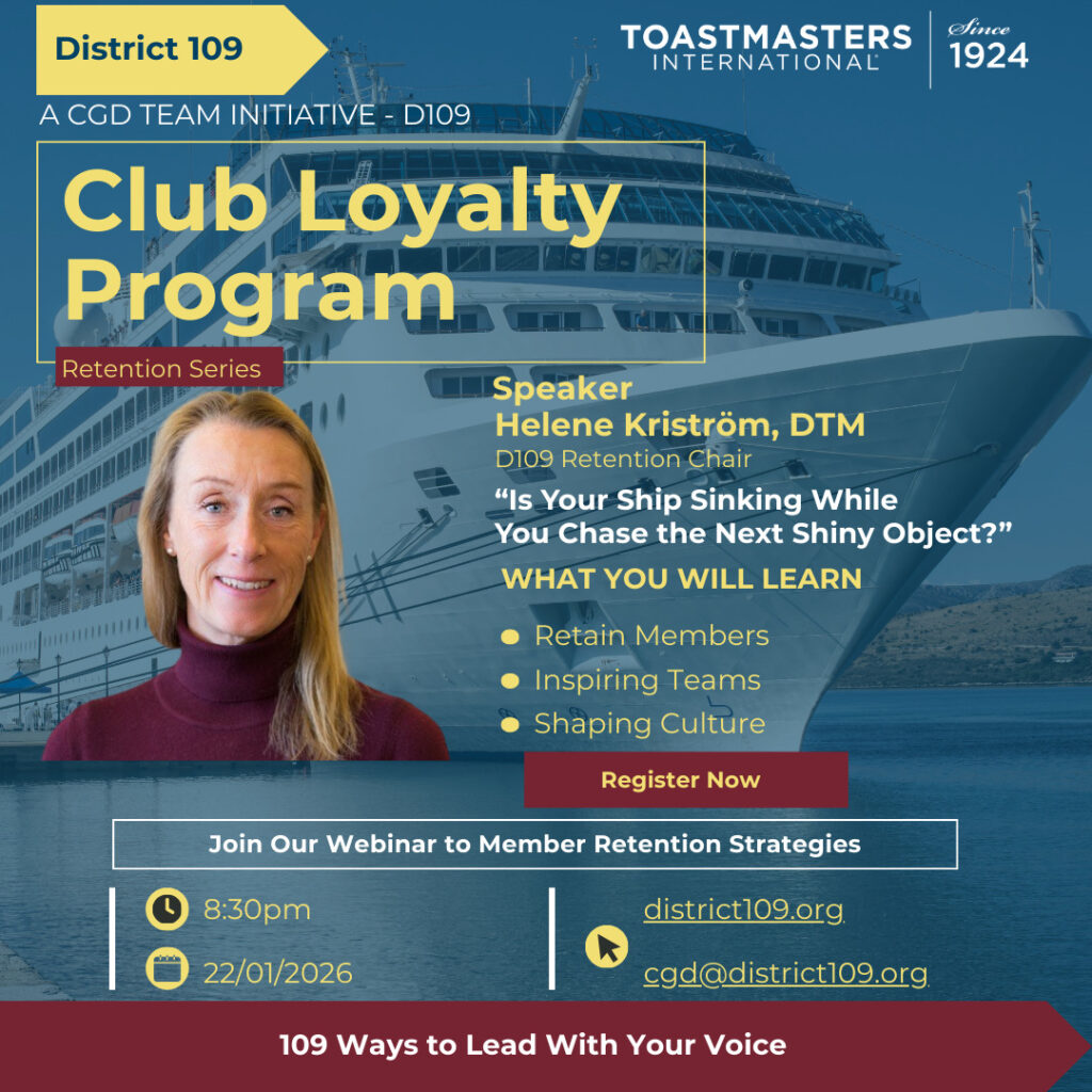 In our midst we’ll have a group of public speaking champions seldom seen in one place. Opening the event will be WCPS multi-finalist, Fursey Gotuaco, DTM, John Zimmer, DTM, and this year’s World Champion of Public Speaking, Sabyasachi Sengupta (Saby). Joined by Carina Schey, DTM who will present a workshop on how to organise contests, and Margherita Brodbeck Roth, DTM who will host a panel discussion with contest winners.