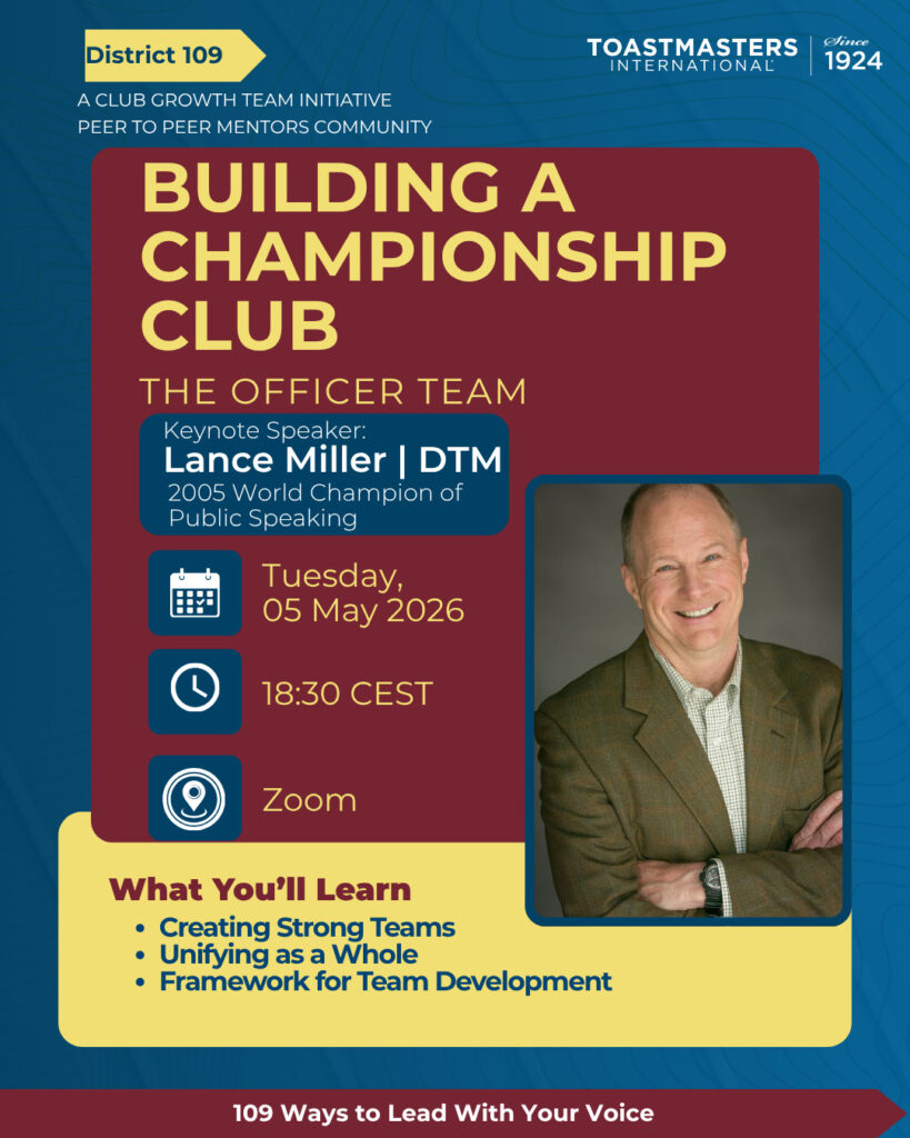 In our midst we’ll have a group of public speaking champions seldom seen in one place. Opening the event will be WCPS multi-finalist, Fursey Gotuaco, DTM, John Zimmer, DTM, and this year’s World Champion of Public Speaking, Sabyasachi Sengupta (Saby). Joined by Carina Schey, DTM who will present a workshop on how to organise contests, and Margherita Brodbeck Roth, DTM who will host a panel discussion with contest winners.
